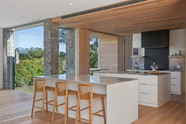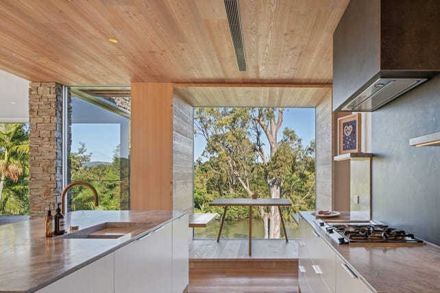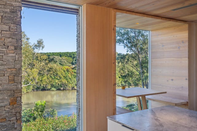 Internally, innovation meets scale. Towering ceilings are grounded by wide-profile, white-oiled Larch floors. An engineered slimline sliding door system, the first of its kind in Queensland, seamlessly dissolves boundaries between inside and out. At its heart, a sculptural two-way fireplace anchors voluminous living zones, while a gourmet Gaggenau kitchen, defined by dual Tuscan marble islands, brushed copper tapware, and a riverfront breakfast nook, becomes the soul of the home.
