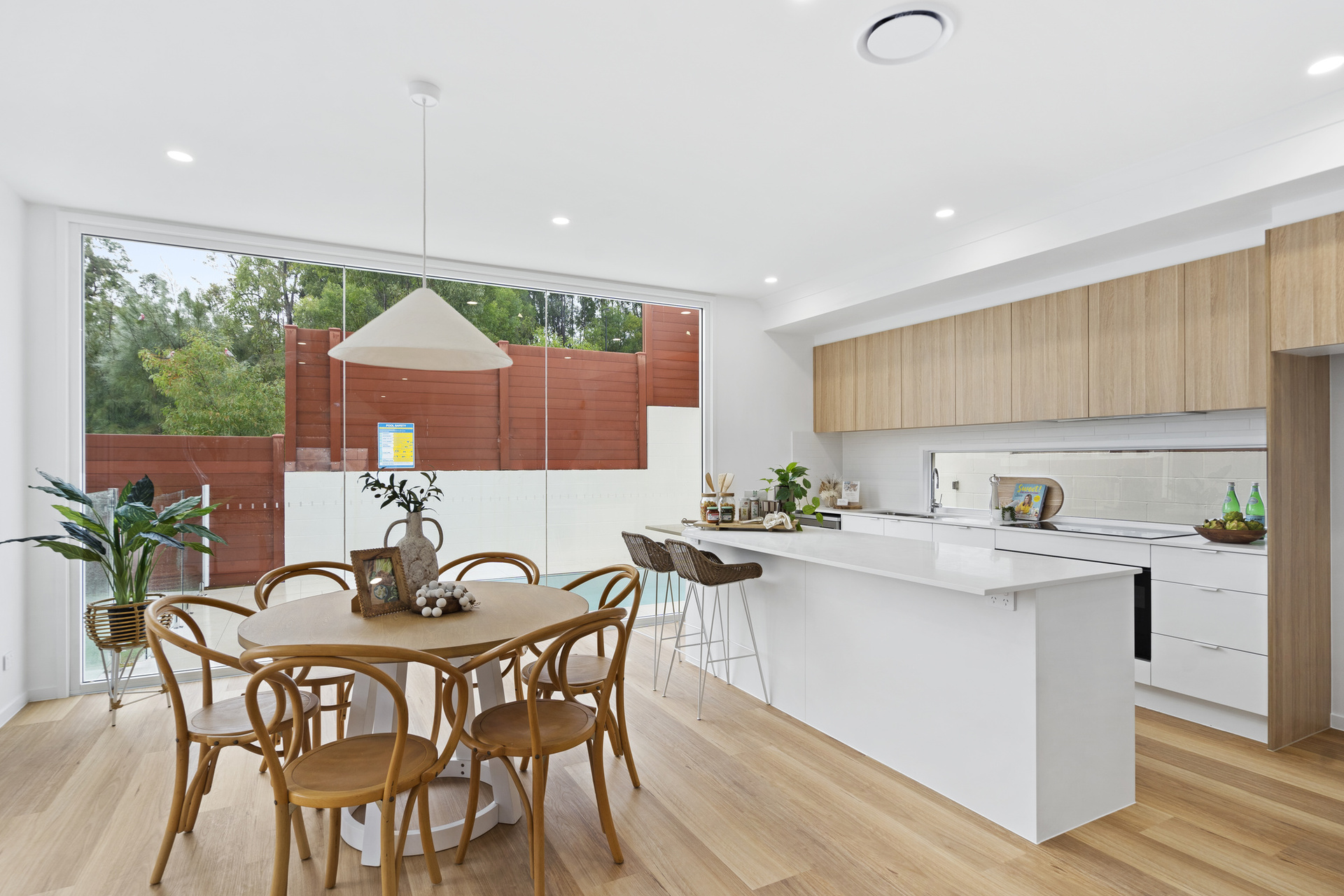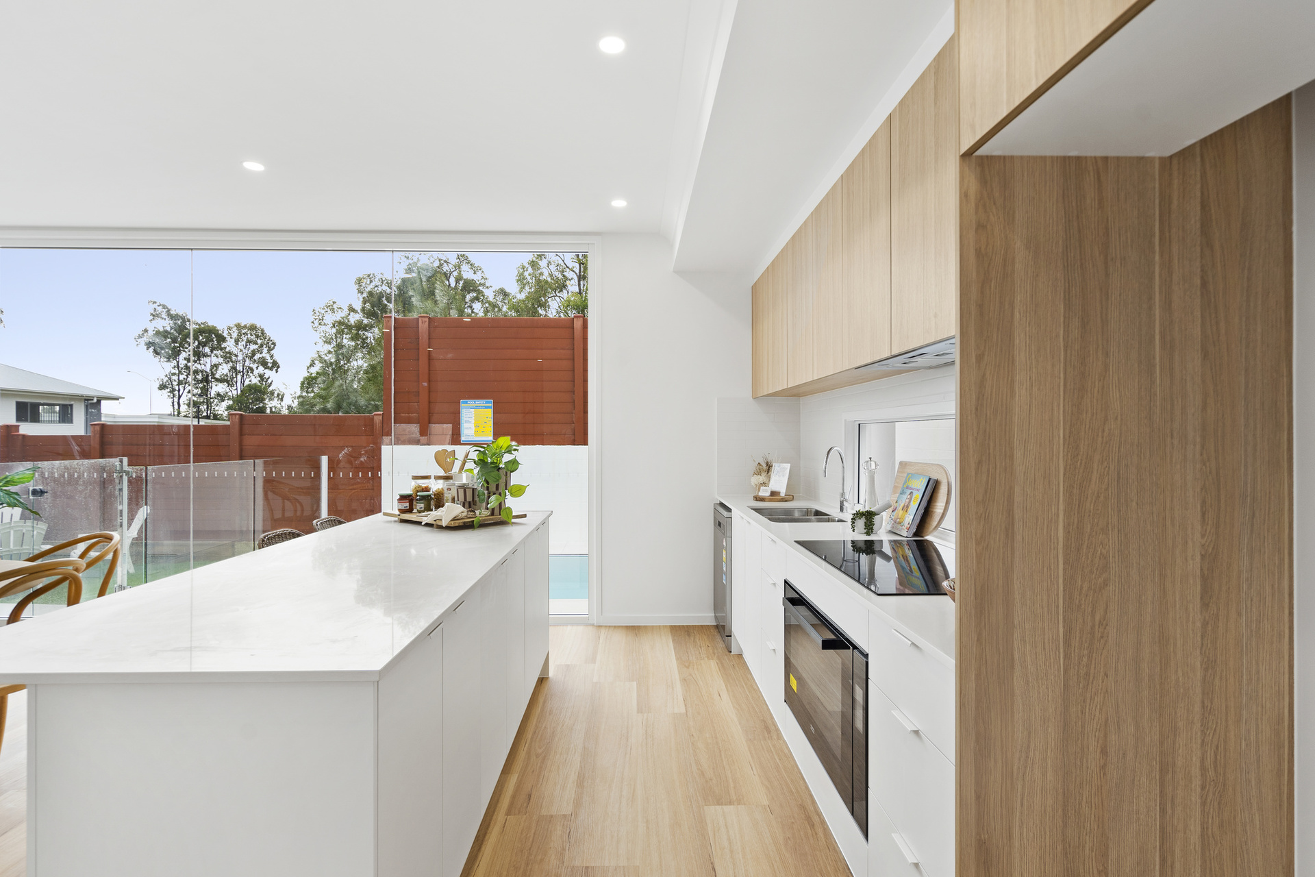 The home offers an airy, open layout, enhanced by a neutral colour palette that creates a sophisticated yet inviting atmosphere. At the heart of the home, the chef's kitchen boasts sleek cabinetry, a generous island bench, and top-tier appliances, flowing effortlessly into the living area and onto a spectacular alfresco space. The sheltered outdoor area, complete with a sparkling in-ground pool, provides a private retreat perfect for entertaining. The backyard, with its low-maintenance landscaping and grassy area, ensures easy living while still offering space for children and pets.