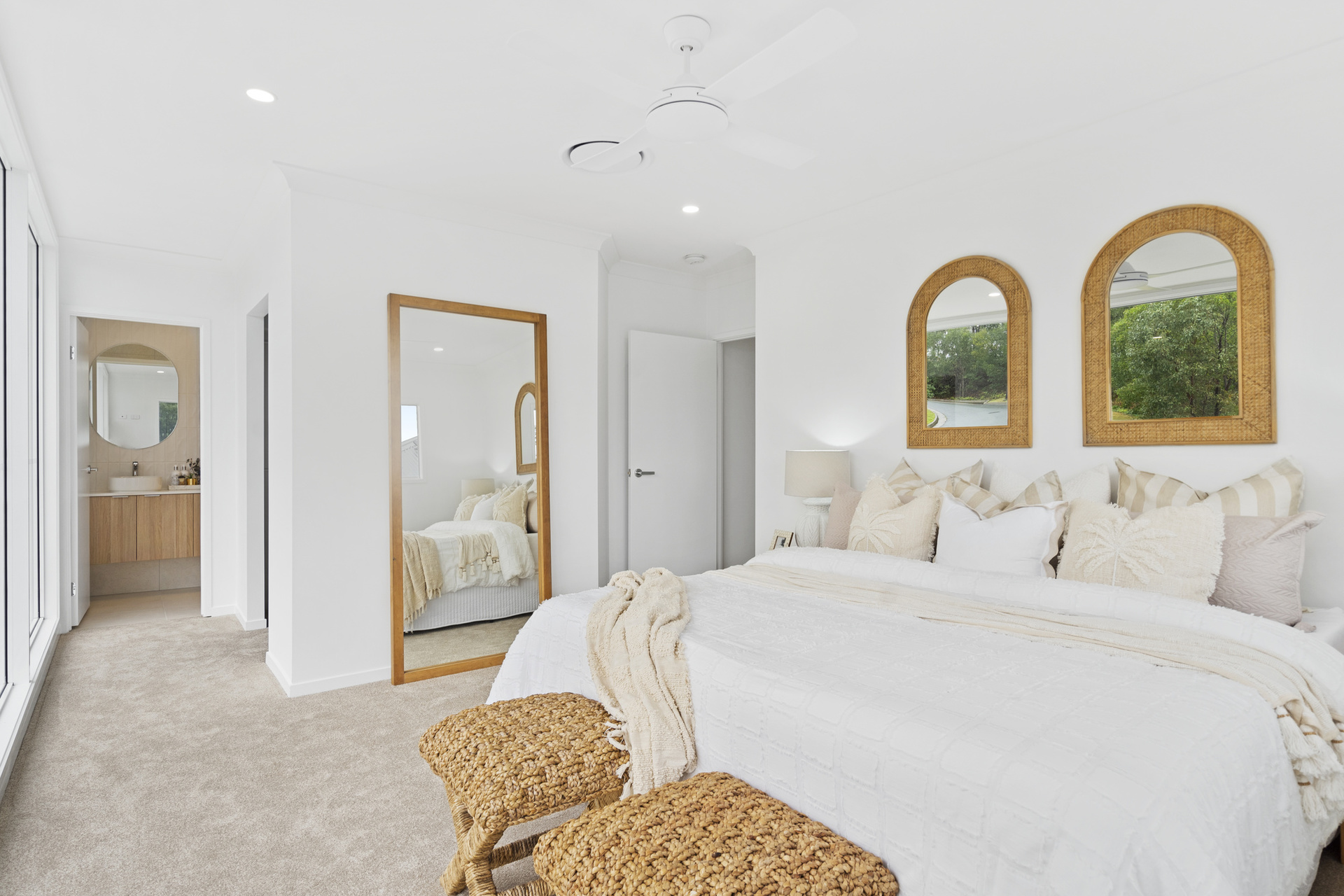 The master suite is a luxurious escape, featuring a walk-in robe, ensuite with double sinks, and large windows overlooking tranquil greenery. Three additional bedrooms, each with walk-in robes and ceiling fans, provide ample space for family or guests. An additional guest bathroom with a spa bath enhances the overall sense of comfort and luxury.