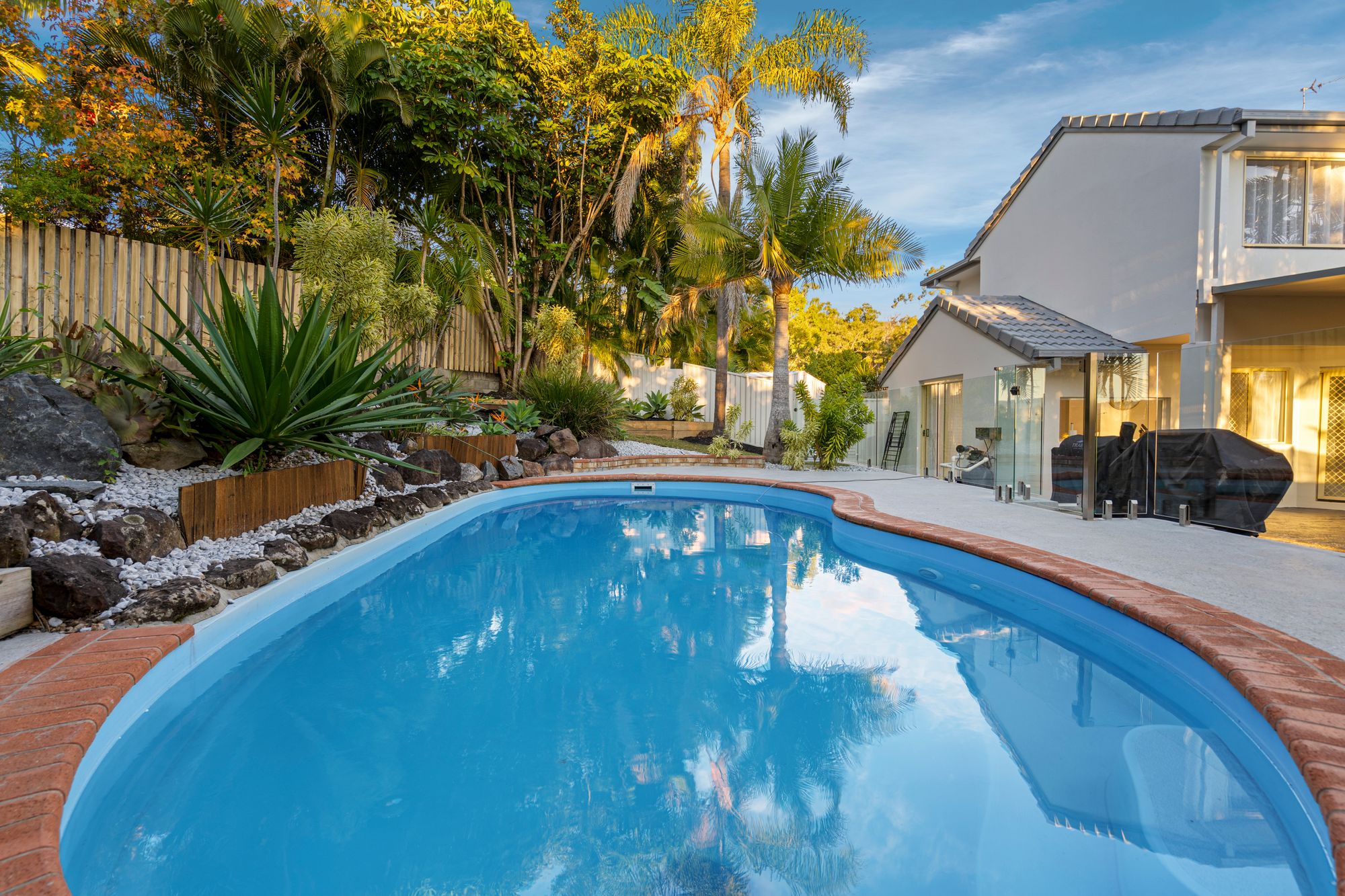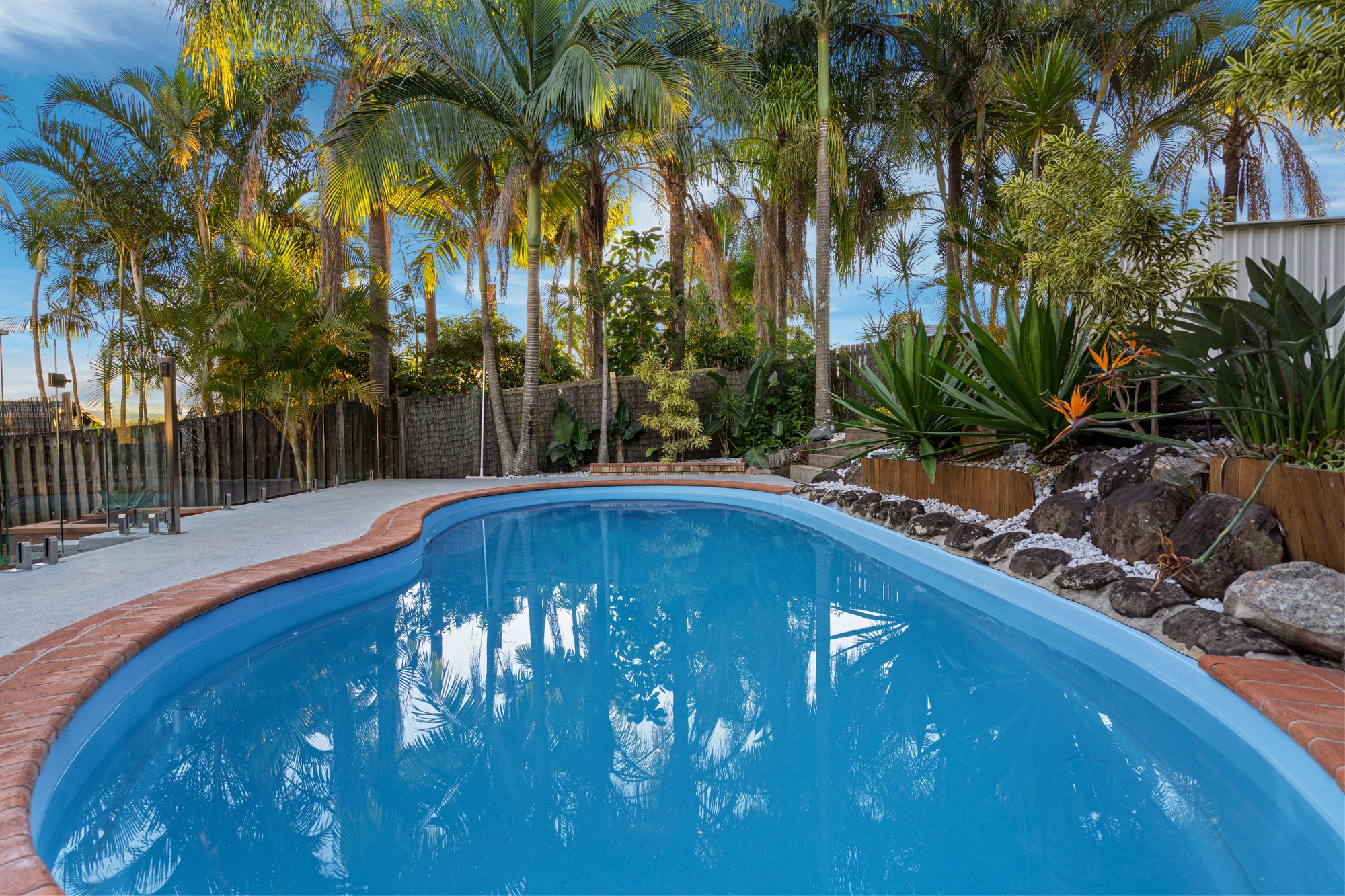 - Sparkling inground swimming pool with landscaped gardens and frameless glass fencing.