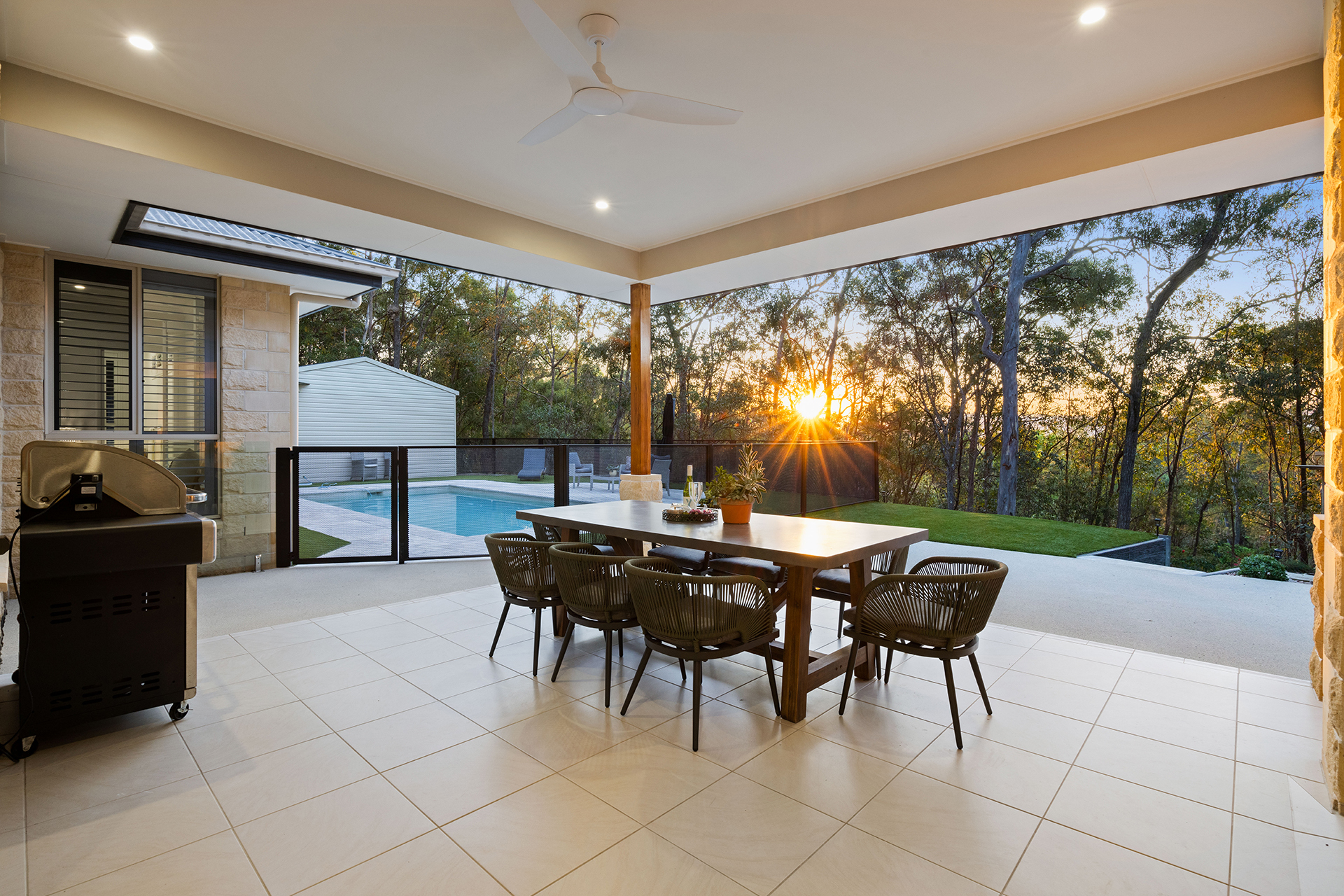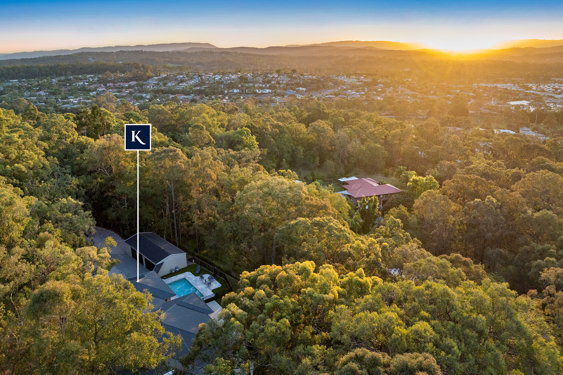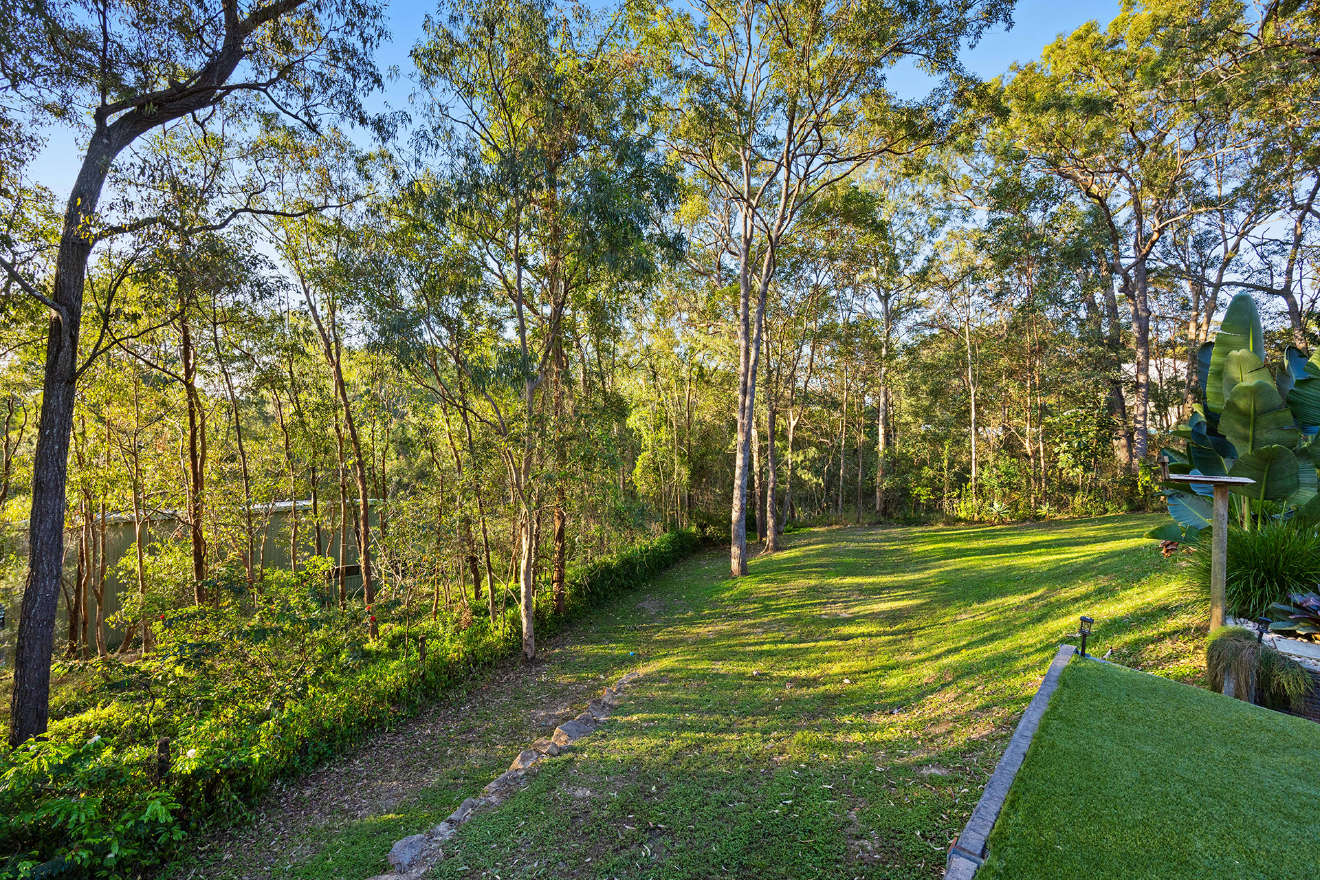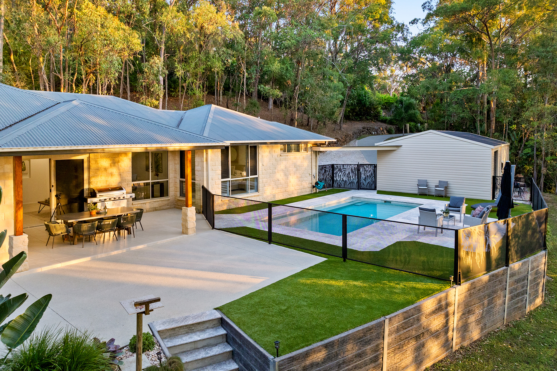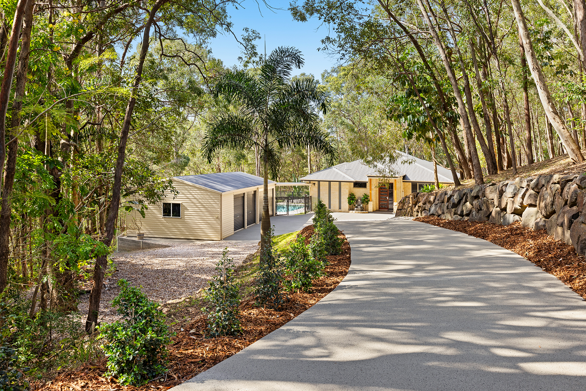 - Beautiful family home atop lush 4,093m2* parcel - Secluded at the end of a shared Body Corporate driveway - Set in a sought-after acreage street offering peace and proximity to amenities, including M1 - Conceived by renowned local building designer Stuart Osman; only one owner since construction in 2009 - Steel frame house with bolstered concrete sandstone brickwork; timeless interior with practical tiles and German craft cabinetry throughout; ceilings are 3m*-high in living areas, 2.7m*-high in bedrooms - Saltwater chlorinated swimming pool surrounded by travertine tiles; premium artificial turf; abundance of secure, grassy land - Covered entertaining area leading to alfresco patio, great for entertaining poolside - Open kitchen, living, dining and sitting zone with beautiful bushland outlook and outdoor access - Living room features combustion wood heater - Kitchen features Ilve 90cm gas/electric oven and cooktop with teppanyaki plate; Miele dishwasher; double sink; island with storage and seating; large walk-in pantry with abundance of storage - Spacious master bedroom features walk-in robe and ensuite with large shower, dual vanity and private toilet - Private wing with a family room and three additional bedrooms, all with built-in robes - Media room with engineered timber floor; sizeable study - Main bathroom features open double vanity, private built-in bath and shower, private toilet - Powder room with single vanity and toilet - Large laundry with sink, storage and outdoor access - Large shed with three electric doors and three-phase power; space for four cars; additional parking space for cars, caravan or trailer - Daikin ducted, three-phase inverted, reverse-cycle air-conditioning; ceiling fans throughout - Ducted vacuum system with floor sweeps in kitchen and main bathroom - Three-phase power to shed; Solahart solar hot water system - Tinted windows throughout; security screens to bedrooms; fully-insulated Colorbond roof -