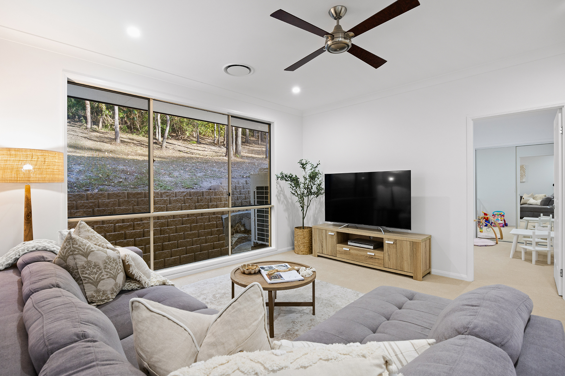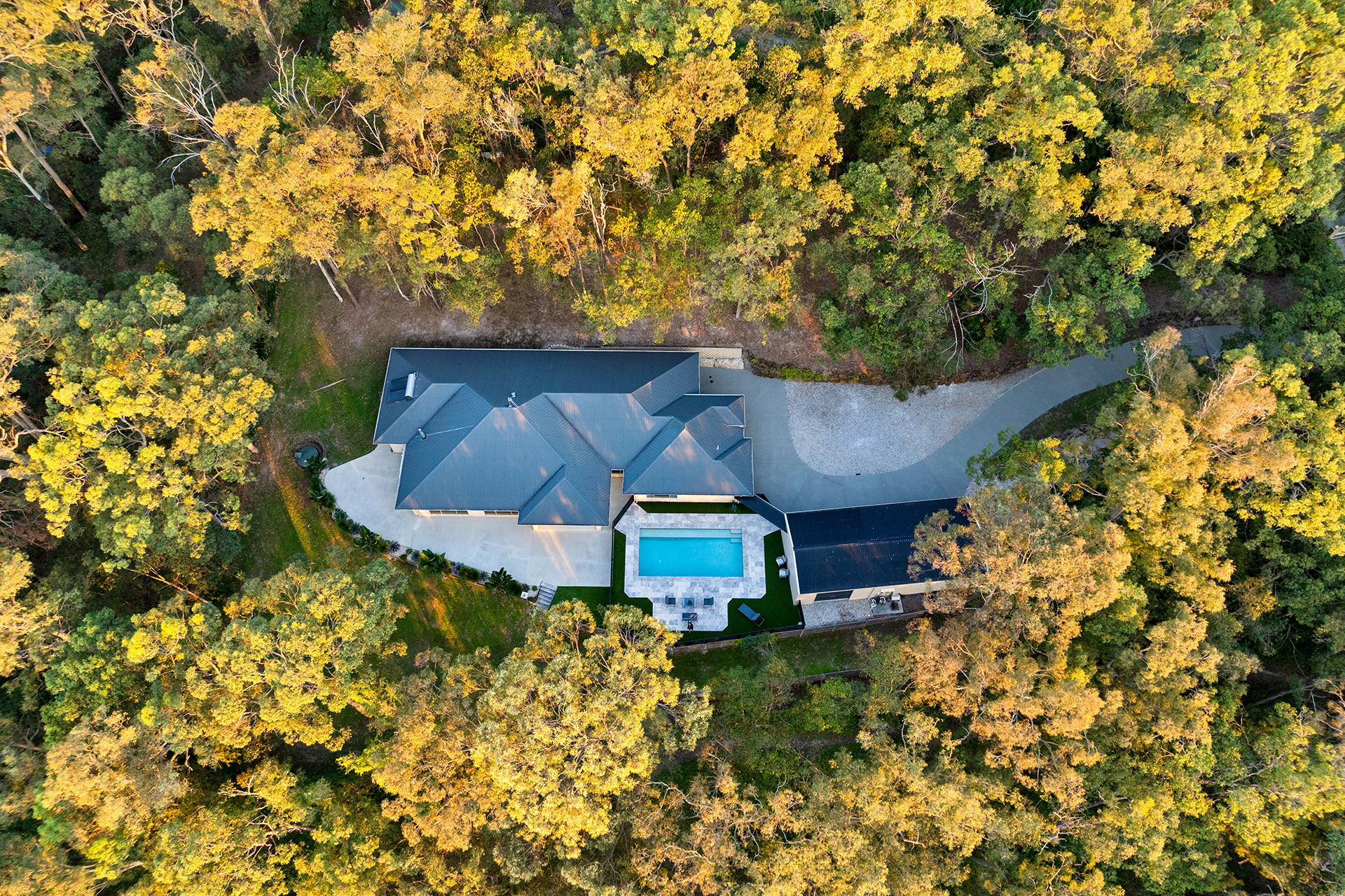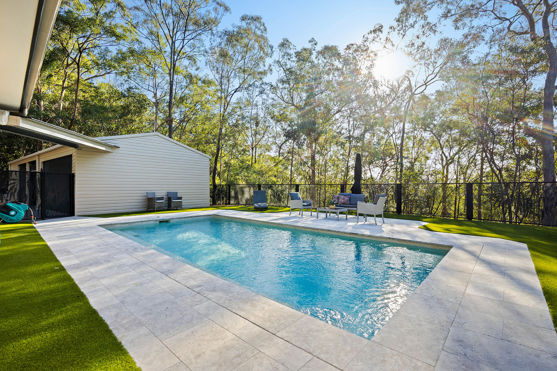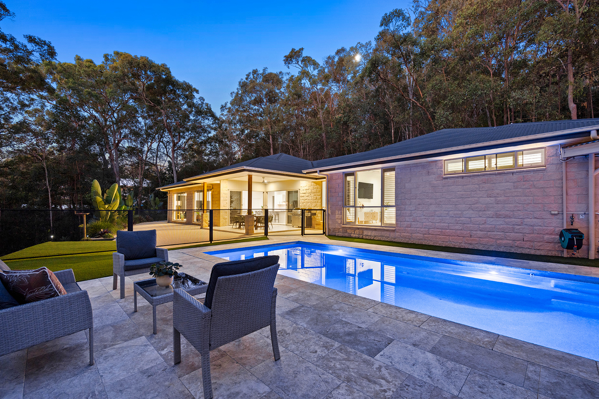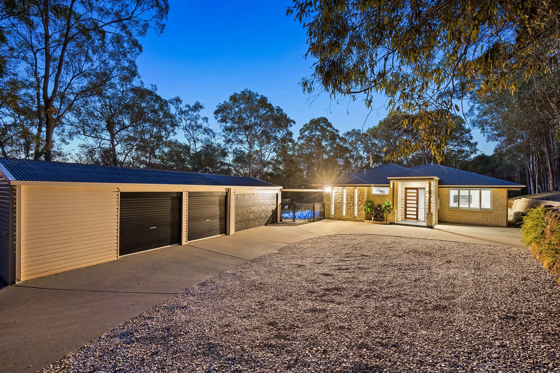 - Beautiful family home atop lush 4,093m2* parcel - Secluded at the end of a shared Body Corporate driveway - Set in a sought-after acreage street offering peace and proximity to amenities, including M1 - Conceived by renowned local building designer Stuart Osman; only one owner since construction in 2009 - Steel frame house with bolstered concrete sandstone brickwork; timeless interior with practical tiles and German craft cabinetry throughout; ceilings are 3m*-high in living areas, 2.7m*-high in bedrooms - Saltwater chlorinated swimming pool surrounded by travertine tiles; premium artificial turf; abundance of secure, grassy land - Covered entertaining area leading to alfresco patio, great for entertaining poolside - Open kitchen, living, dining and sitting zone with beautiful bushland outlook and outdoor access - Living room features combustion wood heater - Kitchen features Ilve 90cm gas/electric oven and cooktop with teppanyaki plate; Miele dishwasher; double sink; island with storage and seating; large walk-in pantry with abundance of storage - Spacious master bedroom features walk-in robe and ensuite with large shower, dual vanity and private toilet - Private wing with a family room and three additional bedrooms, all with built-in robes - Media room with engineered timber floor; sizeable study - Main bathroom features open double vanity, private built-in bath and shower, private toilet - Powder room with single vanity and toilet - Large laundry with sink, storage and outdoor access - Large shed with three electric doors and three-phase power; space for four cars; additional parking space for cars, caravan or trailer - Daikin ducted, three-phase inverted, reverse-cycle air-conditioning; ceiling fans throughout - Ducted vacuum system with floor sweeps in kitchen and main bathroom - Three-phase power to shed; Solahart solar hot water system - Tinted windows throughout; security screens to bedrooms; fully-insulated Colorbond roof -