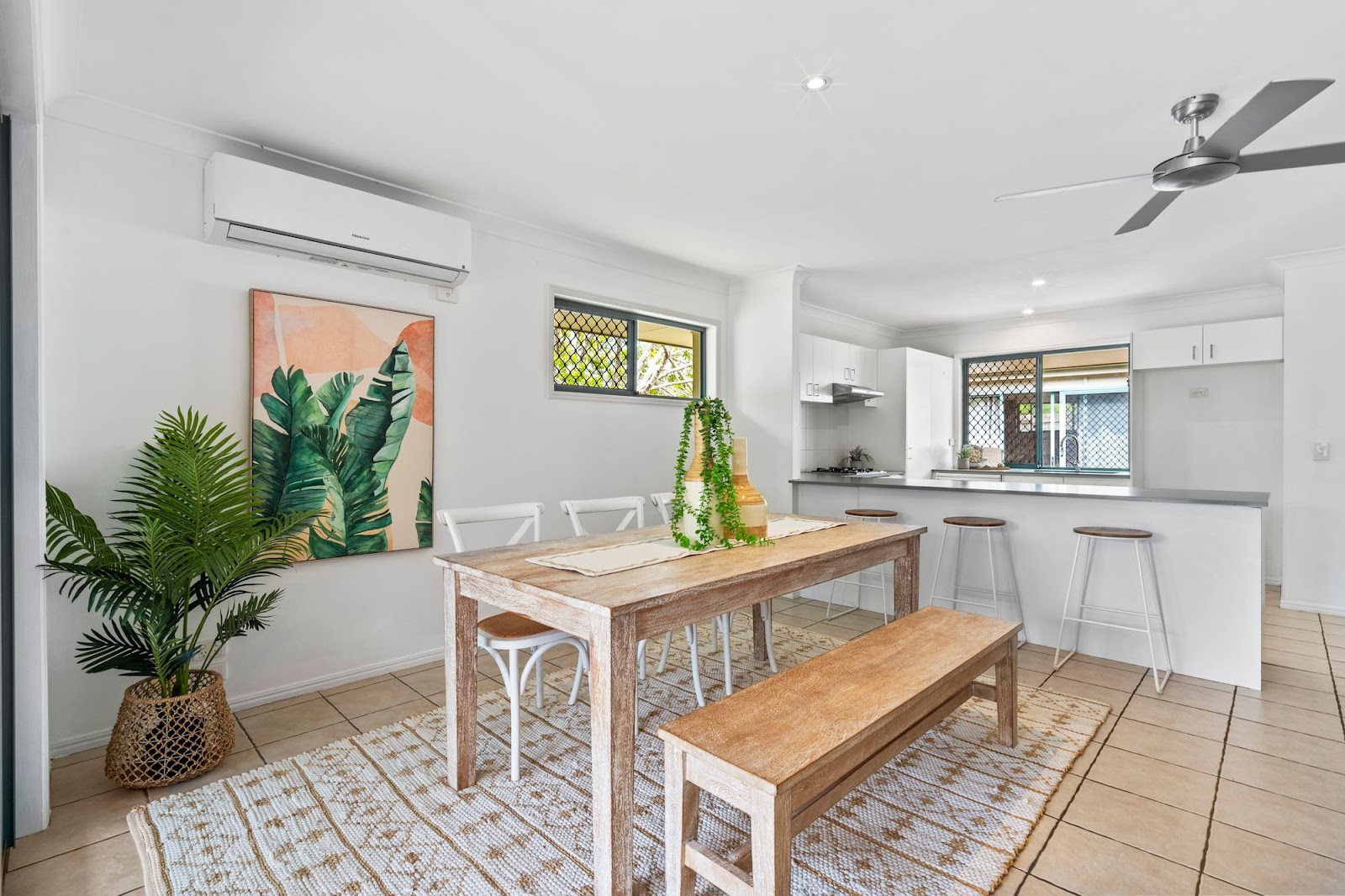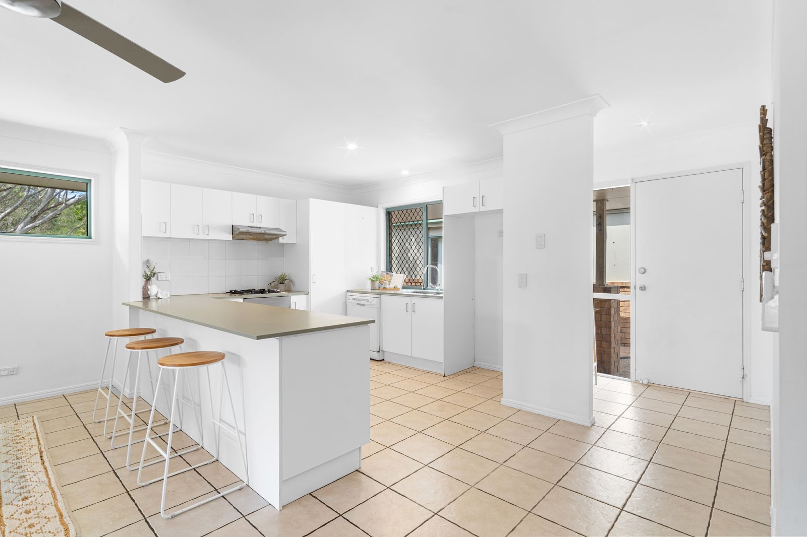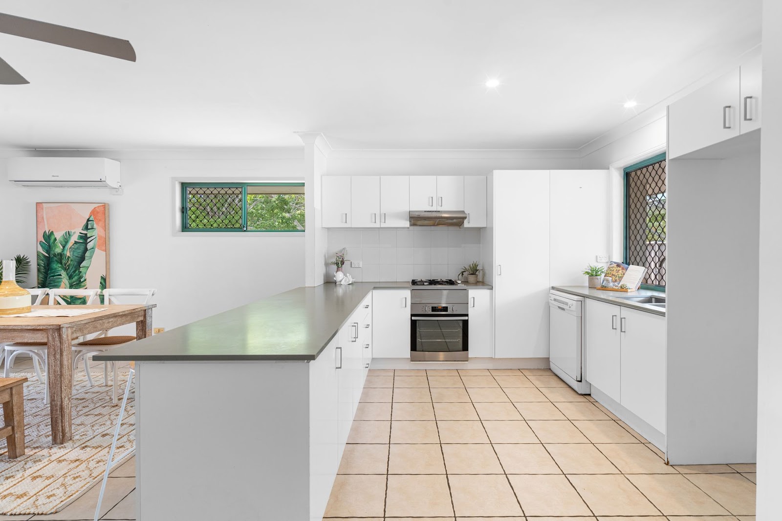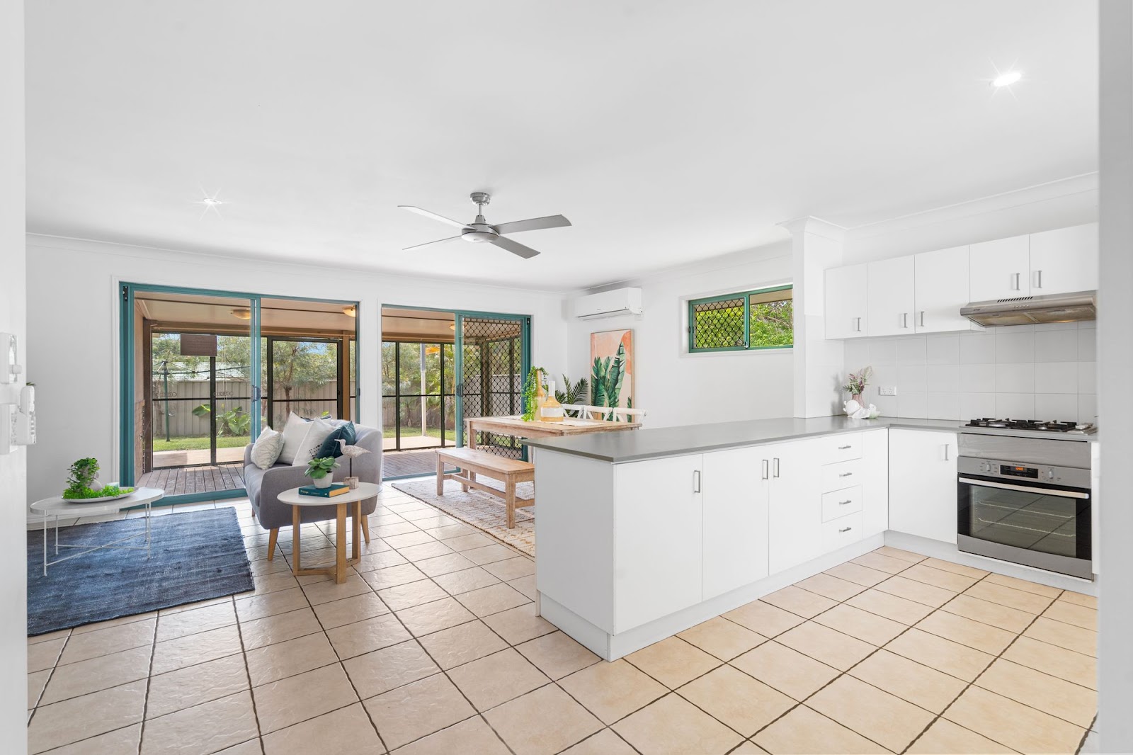 The level open living floor plan is enhanced with a modernized new kitchen with electrical and gas appliances and stone bench tops. Air conditioning and ceiling fans moderate the spacious ambiance from the family lounge to the north facing sunroom looking towards the alfresco outdoor entertainment patio. The bedrooms are peaceful retreats with the master bedroom providing that extra satisfaction and privacy with an en-suite along with air-conditioning. The new laundry room allows external access to the side yard.