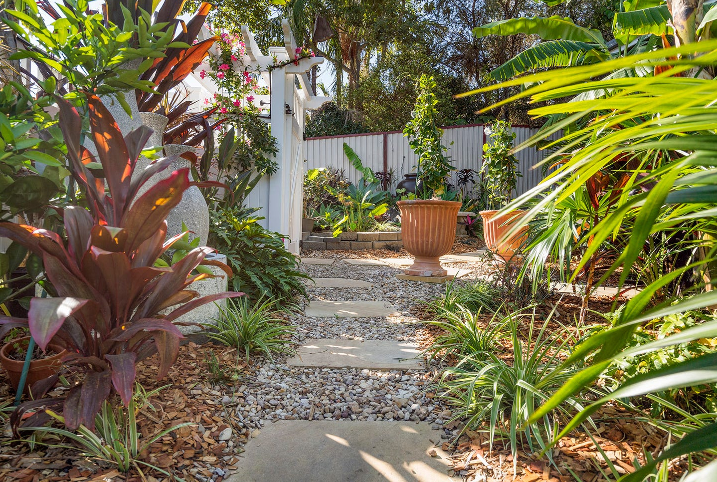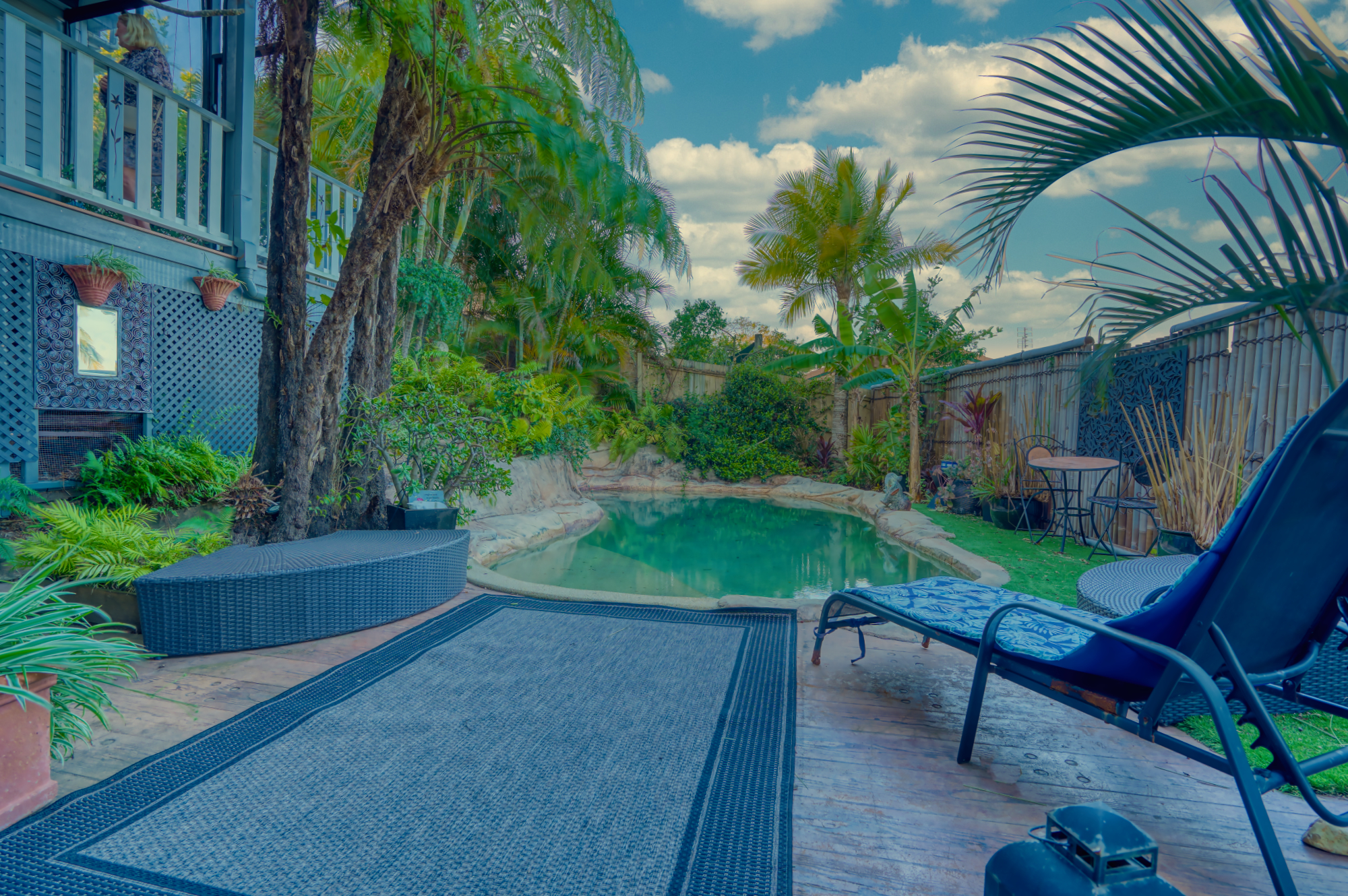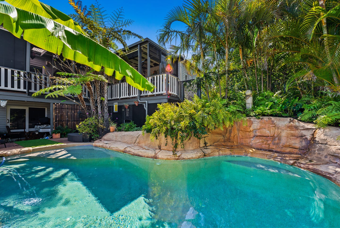 • Full-length front verandah offering a perfect space to soak in the beauty of the landscaped gardens. • Solar-heated inground pool with a self-chlorinator & new pool pump, surrounded by tropical foliage. • Beautifully landscaped gardens with water features, fishponds, and a quaint courtyard shaded by tropical trees. • Solar power system to reduce energy costs. • Steel frame tool shed and ample underground storage. • Fully fenced for kids and dogs to play.