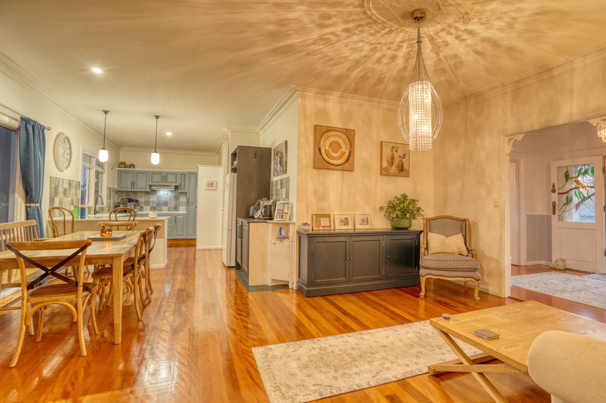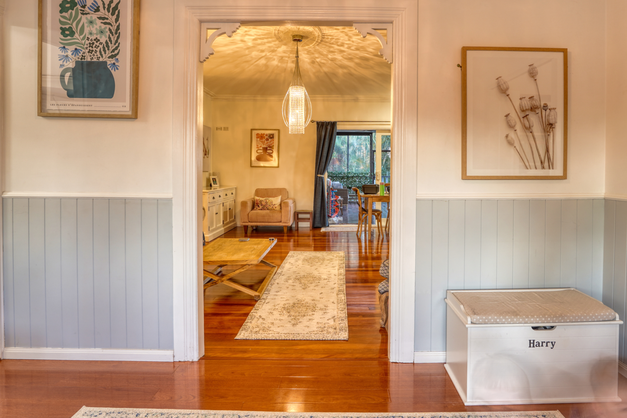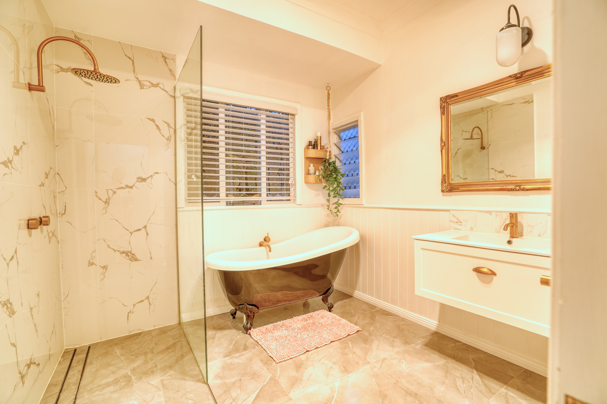 • Informal lounge and dining adjacent to a stylish Shaker-style kitchen, featuring quality engineered benchtops, designer appliances, and a convenient drinks station. • Four generous bedrooms, including a master suite with a walk-in robe, ensuite, and large French doors opening onto the deck. • Ceiling fans in all bedrooms, and reverse cycle split systems air conditioning in the living area and master bedroom. • Elegant family bathroom featuring a clawfoot tub, gold tapware and separate toilet.