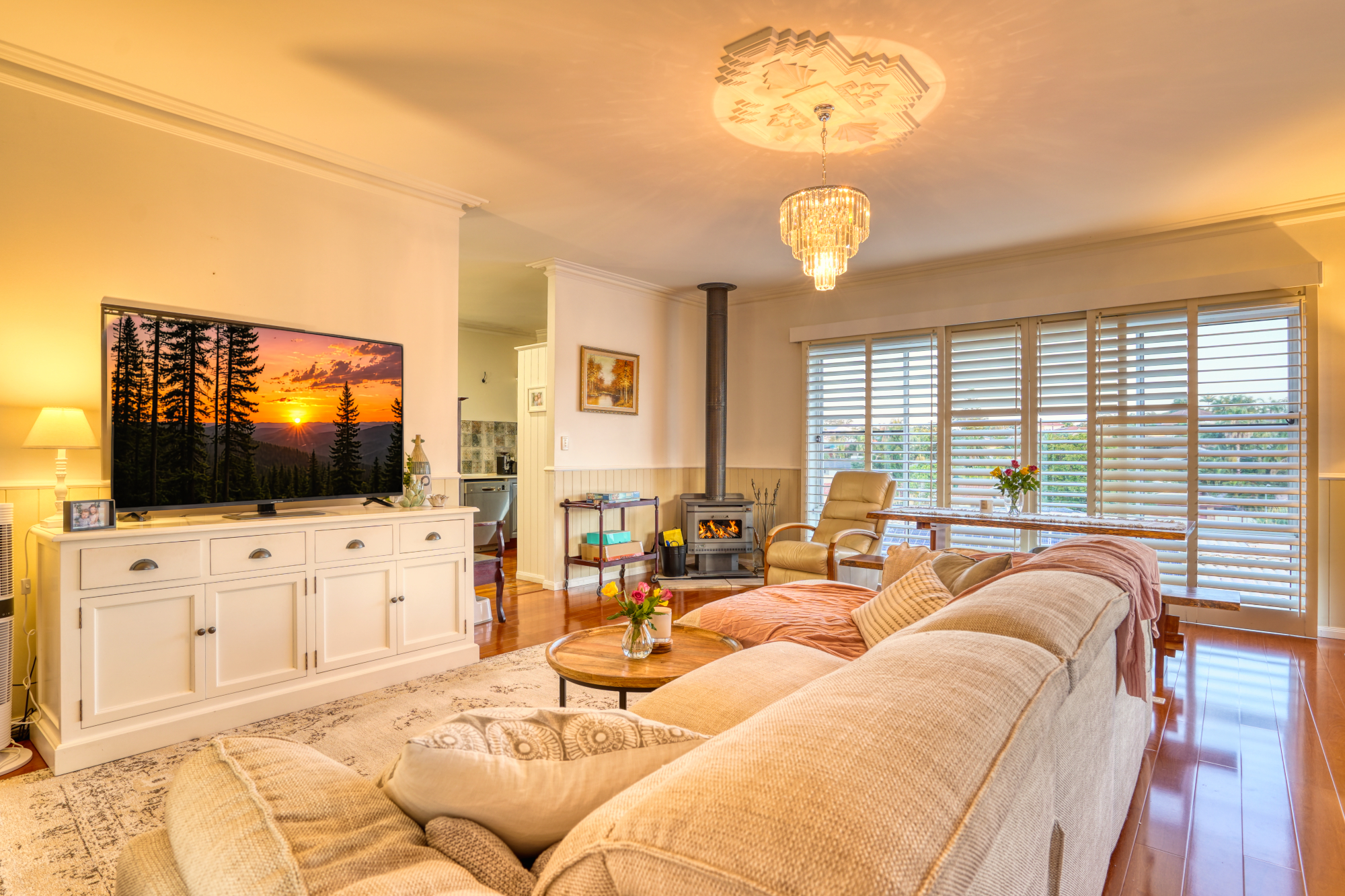 • A beautiful welcoming entrance with vaulted ceilings and decorative ceiling roses, with superb light fittings throughout the home. • Spacious formal lounge with a cozy fireplace and a sun-filled bay window.