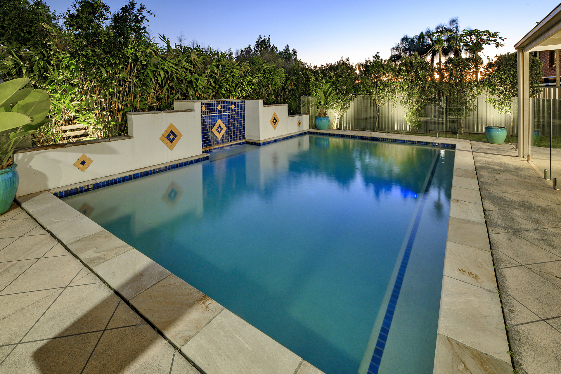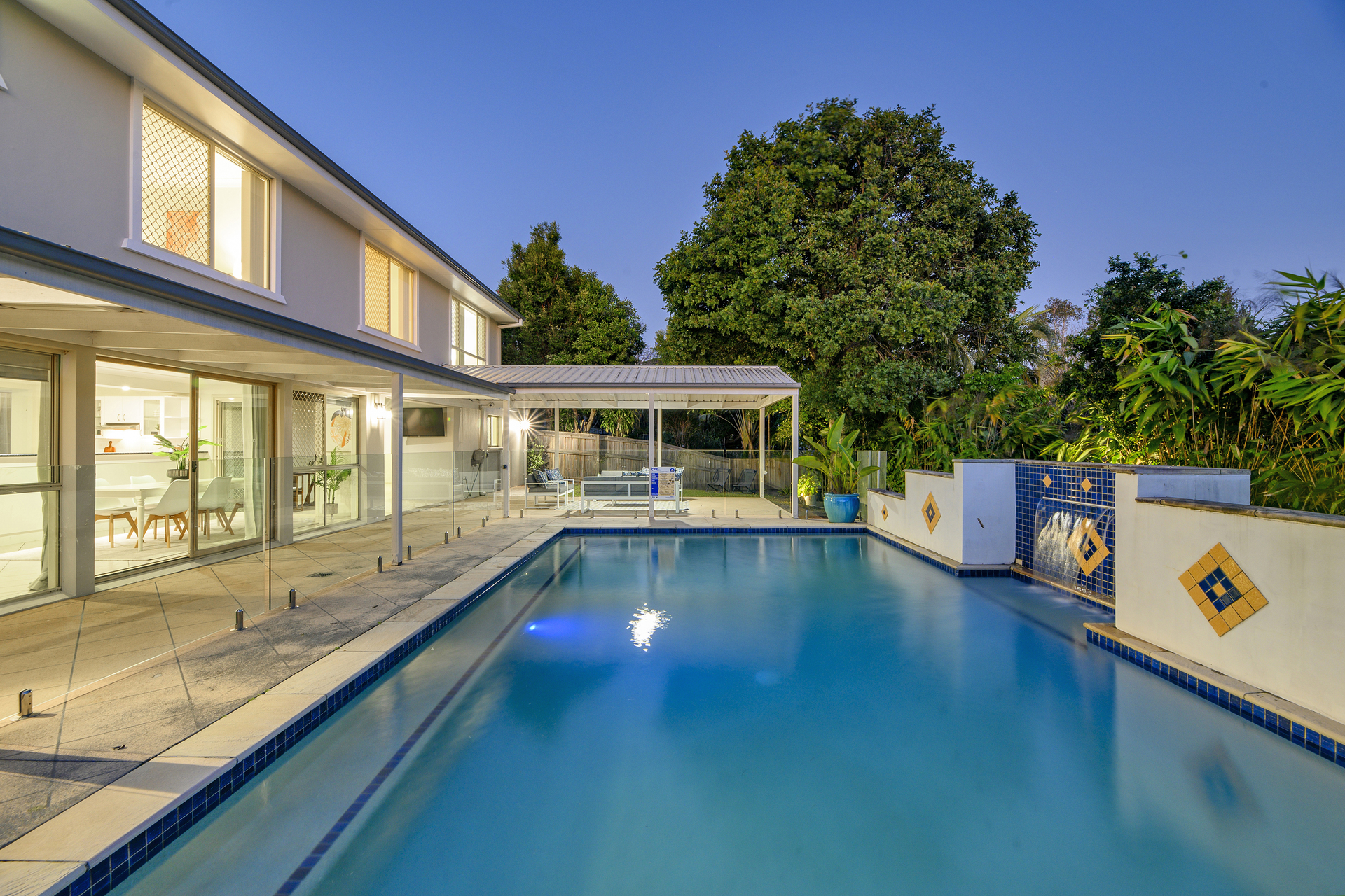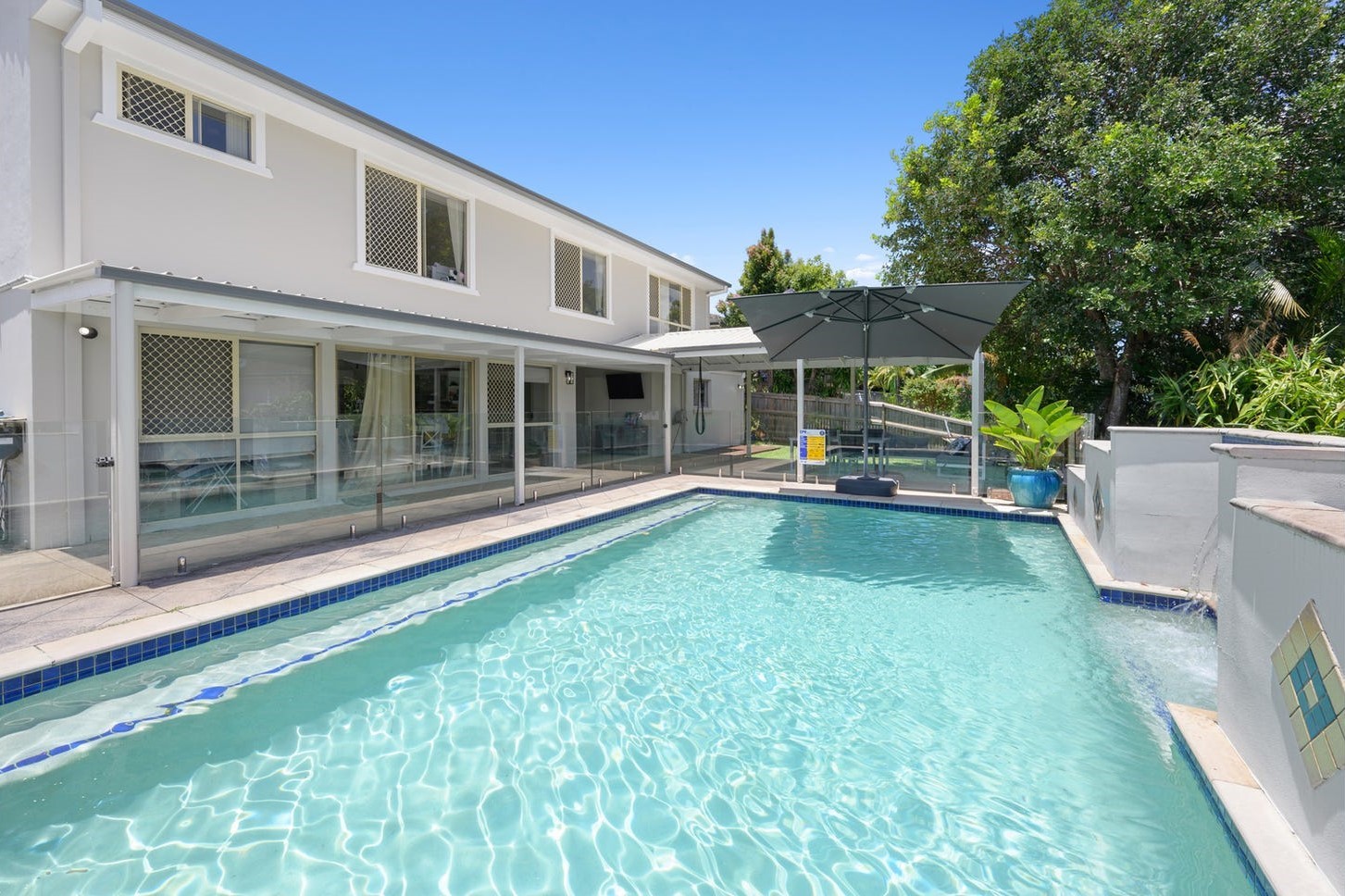 * The sensational covered outdoor entertaining area overlooks the inviting over-sized pool, complete with cascading water feature and large seating step … the perfect place to entertain family & friends for hours on end in the hot, up-coming Summer months ahead