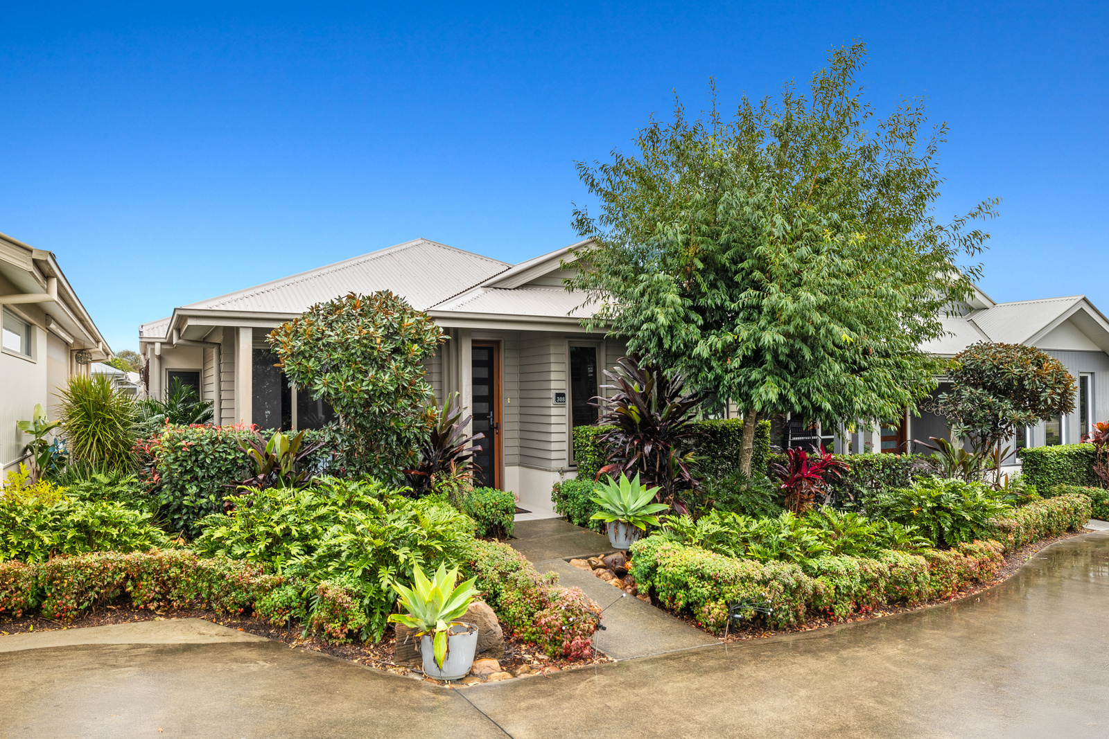 Nestled amidst beautiful tropical gardens, this exquisite three-bedroom home offers the perfect blend of luxury and care-free living- with no lawn to mow.